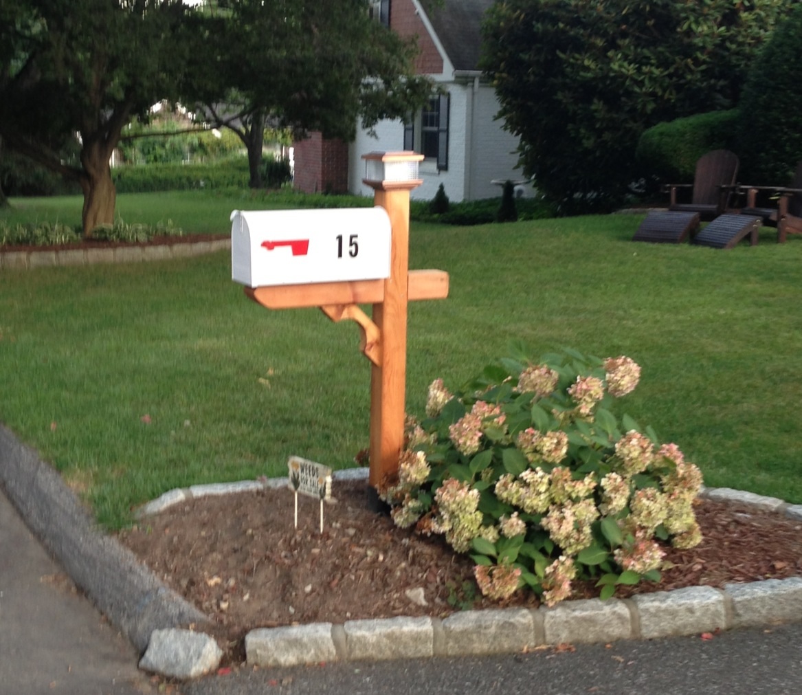 Here’s how it looks now, after the installation of a new post and a spanking new mailbox, which Basil affixed yesterday. The thing on the top is a solar light — a nice addition that I’m sure will come in handy, especially when the Halloween revelers come calling.