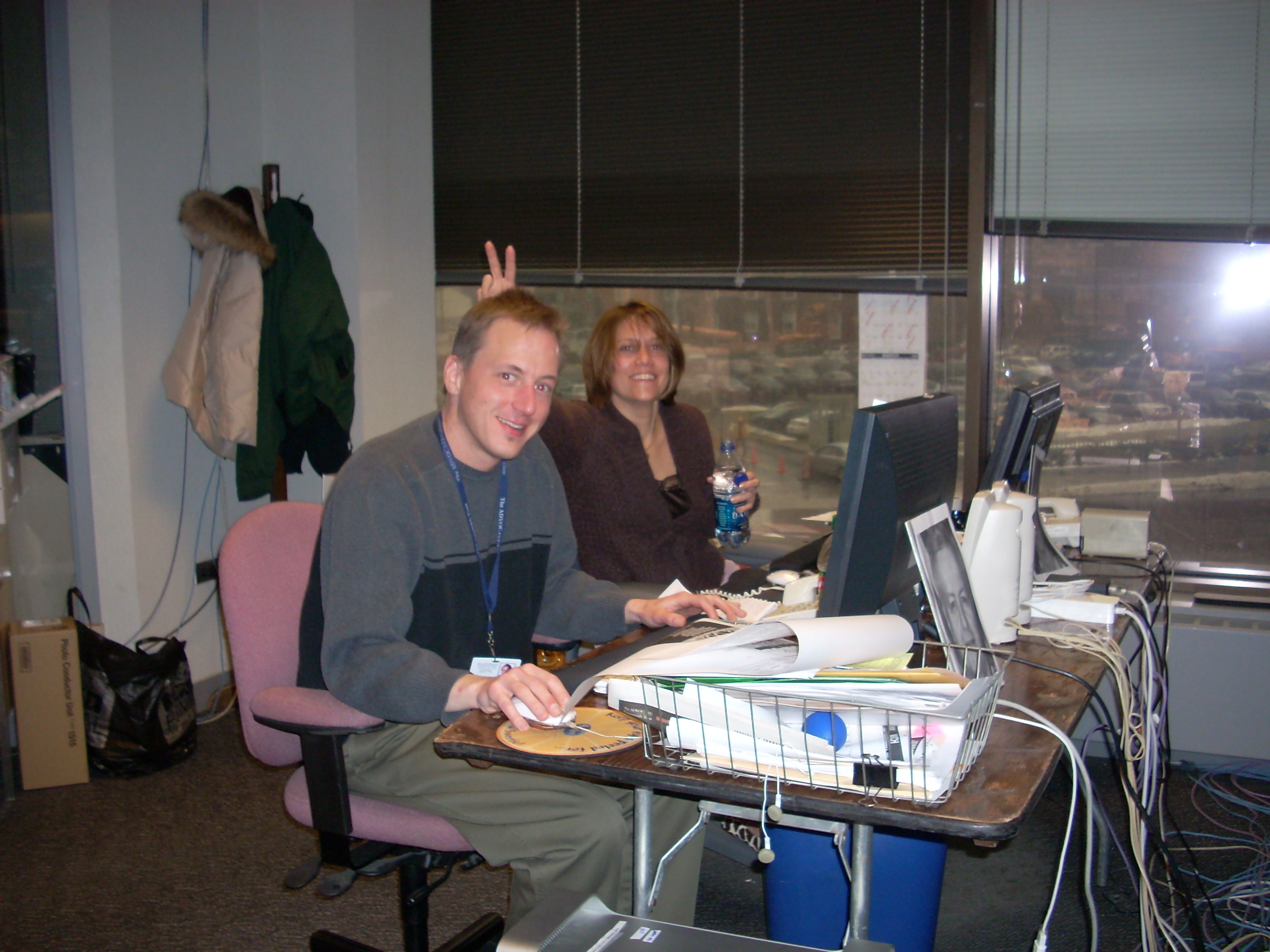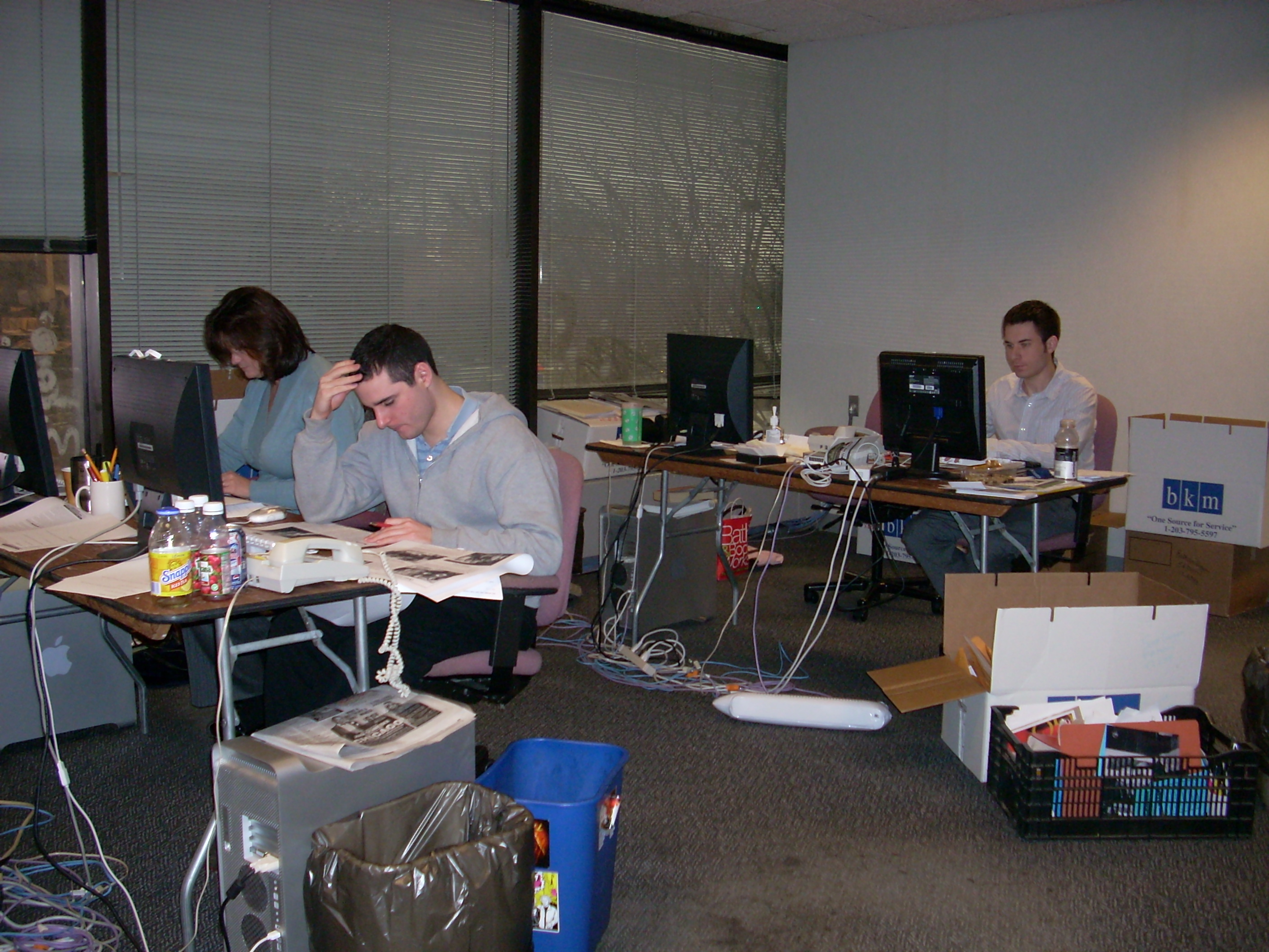 OMG! Just stumbled on this earlier and I’ve been cracking up since. I forgot about the foldout picnic tables. And that picture behind Ray’s monitor was facing Kevin. It was supposed to be an inside joke and now I don’t remember it. But I do think that pic was taken on our last day at Tresser and we were supposed to finish packing up our stuff. That was also the day we took the staff picture out front (staff that was left, that is…) The only features person missing is Beth.