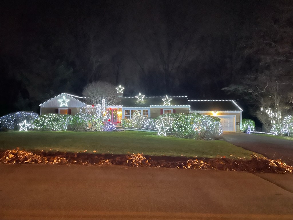 This house in North Stamford, CT, goes all out for the holiday season. Great fun to drive by. Twinkle, twinkle, also in Stamford. Bethany Church in Stamford had a darling holiday stroll with carolers, a living nativity, and this scene from The Grinch Who Stole Christmas. So much fun to see what the congregation pulled together — doubly so because all of them were having so much fun doing it. This one, in the Cove section of Stamford, is a regular on our annual December hunt for signs of the season. Precision work!